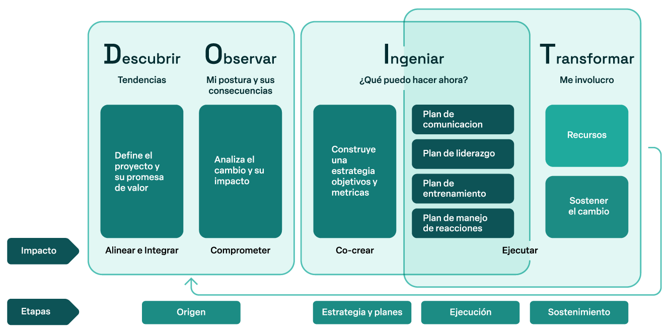 Dotamos a los líderes y a los equipos de las herramientas y la mentalidad necesarias para afrontar las complejidades del cambio. Nuestras metodologías se basan en las últimas investigaciones y prácticas en gestión del cambio, garantizando que usted no sólo se mantiene al día con el cambio, sino que está a la vanguardia del mismo. Aprovechando nuestro exclusivo modelo DOIT, guiamos a las organizaciones a través del proceso de Descubrir la necesidad del cambio, Observar y comprender su impacto, Idear soluciones creativas y Transformar estas ideas en acciones eficaces.